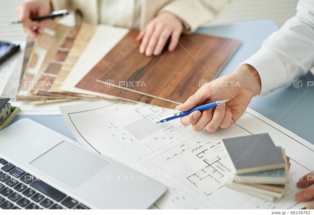お客様のご要望をもとに、具体的なプランを提案いたします。内装の場合、床材、クロスデザイン、水回りの配置などを詳細に検討します。外装の場合、外壁やサイディングのデザイン、材料の選定などを行います。